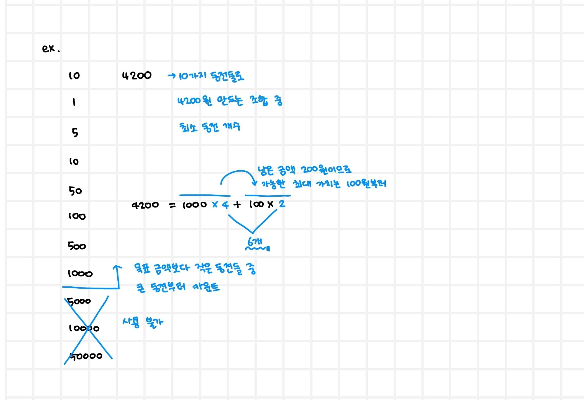 가치가 큰 동전들부터 내림차순으로 사용해야