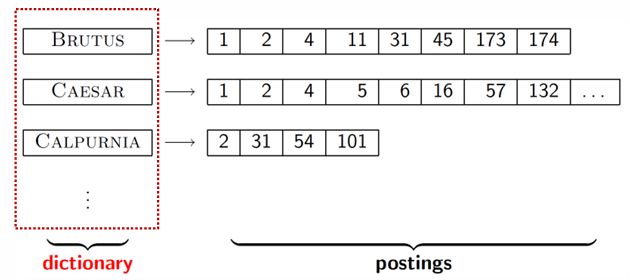 brutus 라는 단어는 1, 2, 4, 11, 31 등의 문서에서 나오고 단어가 등장하는 문서의 id는 postings list에 저장함