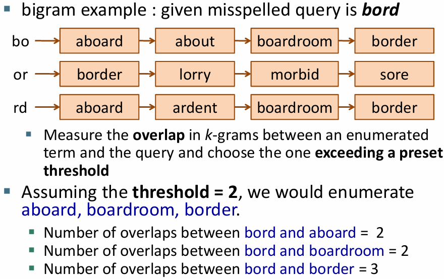 - 대체 단어 선택 : 잘못 입력된 단어 교정 , 대체 단어 중 가장 가까운(편집 거리 = 두 단어 간 차이를 계산해서 가장 가까운 단어 찾기, k-gram 중복 = 두 단어가 공유하는 k 그램 수 사용해서 유사성 판단) 단어 선택 (문서 출현 빈도, 사용자 쿼리 빈도 등)