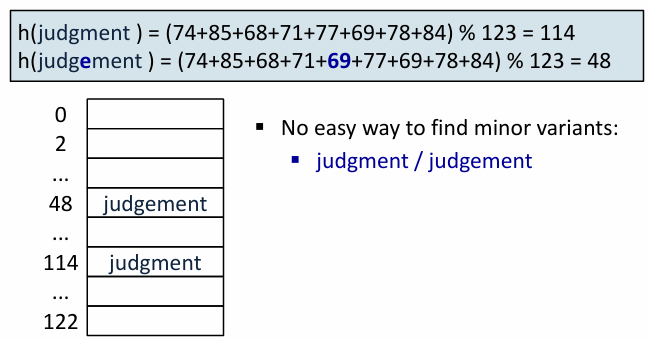 judgement - judgment 같은 의미이지만 구성 철자의 차이로 전혀 다른 해시값을 가짐