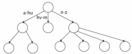 - 알파벳 순서에 따라 단어들이 트리에 배치 (예를 들어 A-M으로 시작하면 왼쪽, N-Z로 시작하면 오른쪽)