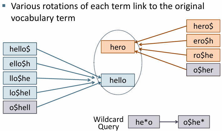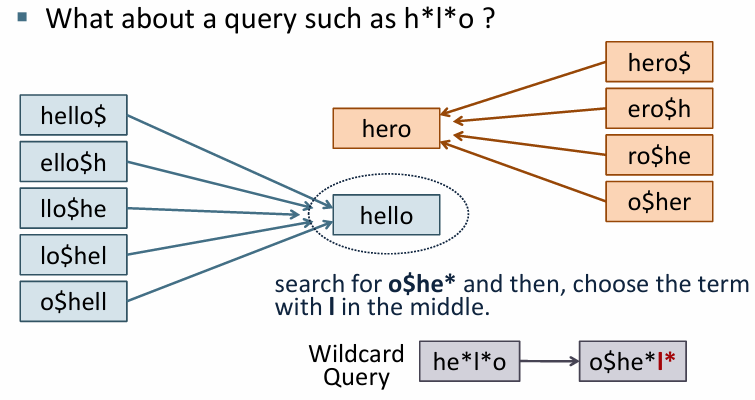 > permuterm 인덱스를 사용하면 와일드카드가 단어의 시작, 중간, 끝에 위치할 때