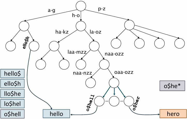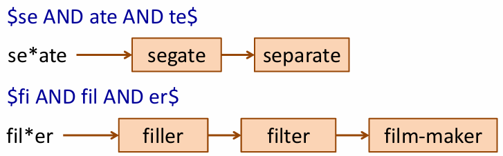 - 접두어 검색 가능 :: automat*으로 검색하면 automatic, automation 등으로 쉽게 찾을 수 있음 (해당 지점부터 하위 노드를 확인하면 되기 때문)