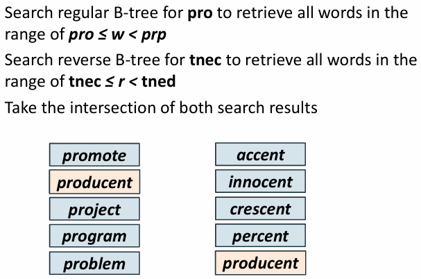 lemon을 찾을 때는 reverse b-tree에서 nomel로 저장하고 mon으로 끝나는 단어들을 찾음