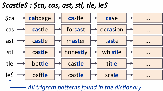 모든 사전 단어에서 가능한 k-gram을 모두 생성해서 k-gram인덱스를 만들어서