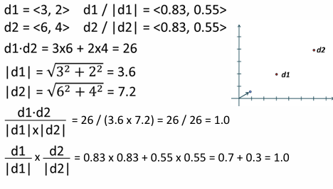 각도를 보면 0에 가까움 = 내용적으로 유사함