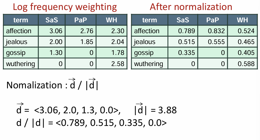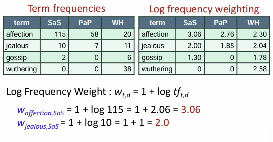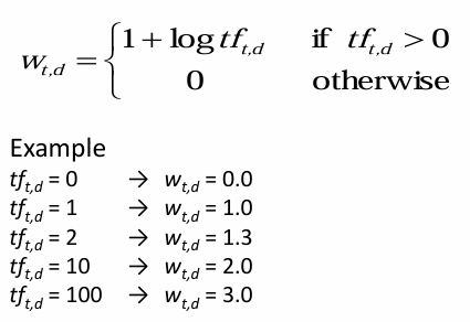 - 로그 스케일 사용 ? 빈도에 비례한 관련성 증가 아님 ... 적당한 관련 정도