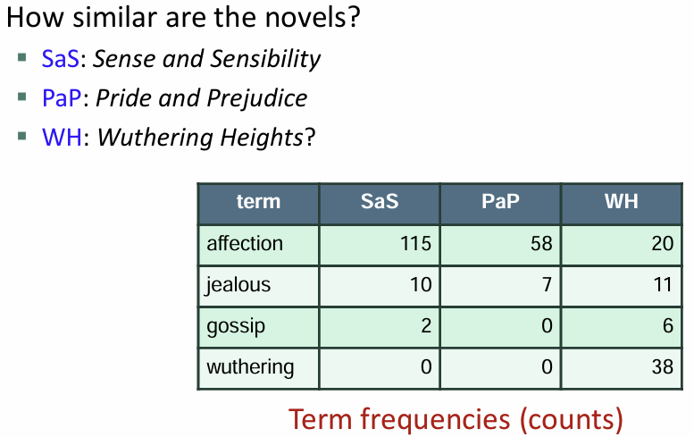 각 문서는 자연수 벡터로 표현 N^|V| .. 등장 빈도를 벡터의 요소로 가지게 됨