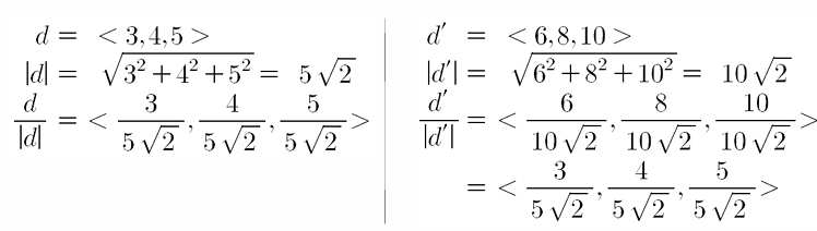 성분 값이 다르지만 정규화 해보면 결국 동일한 벡터