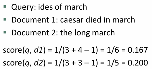 - 두 집합이 겹치는 교집합 비율을 측정하는 계수 = 쿼리와 문서의 매칭 스코어 계산