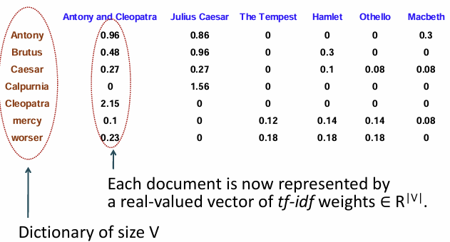 사전의 크기는 동일, 각 문서는 벡터에 의해 구체적인 용어의 빈도로 표현