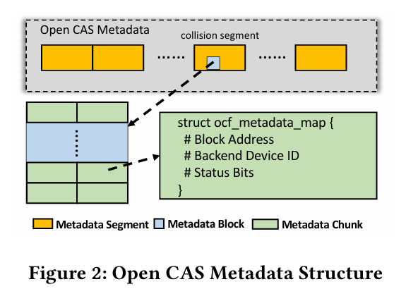 - metadata segment = 캐싱 시스템에서 데이터를 관리하는 데 필요한 메타데이터 정보를 저장하는 기본 단위 - collision segment = 중복 데이터나 충돌이 발생했을 때 관리하는 영역, 메타데이터 블록 간 주소 충돌 해결- metadata block, chunk = 메타데이터는 청크 단위로 나뉘어져 있고 block address, backend device id, status bit 등의 정보를 저장하고 있음