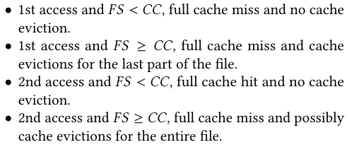 두 번째 접근 FS >= CC : 이전 접근 때 캐시에 파일이 모두 저장되지 못했기 때문에 전체 캐시 미스. 파일 전체에 대한 캐시 제거 발생 가능성 있음.