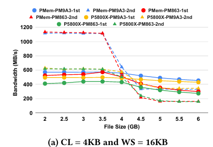 - PMem은 대용량 쓰기 작업에서도 뛰어난 성능을 안정적으로 유지함