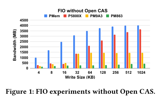 - Open CAS를 사용하지 않은 상태에서는 PMem과 P5800X가 가장 높은 대역폭을 나타냄
