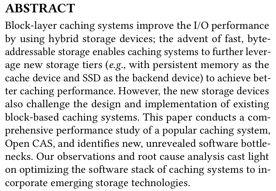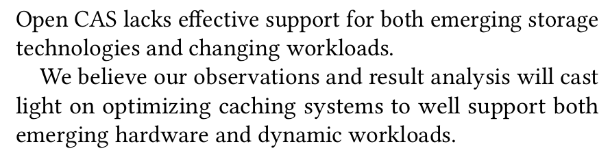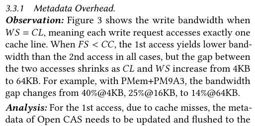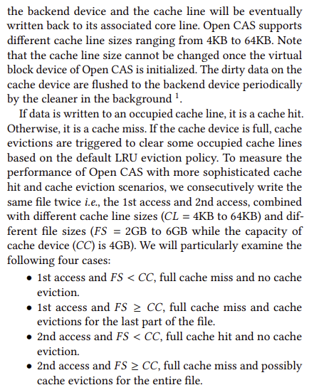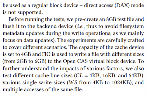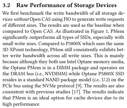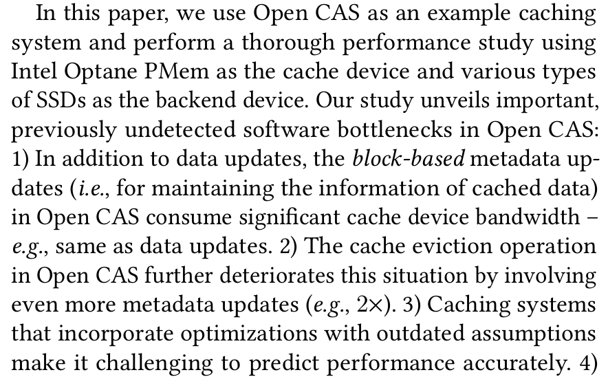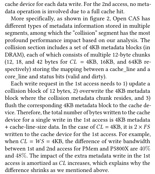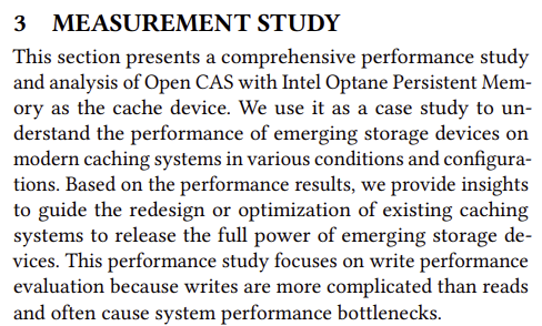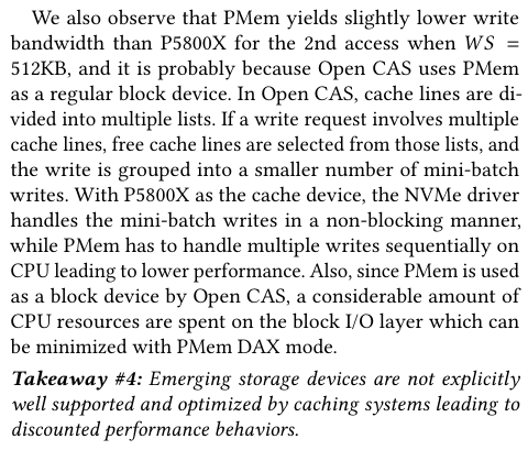 intel optane persistent memory를 캐시로 사용하는 open CAS에 대한 종합적인 성능을 연구하고 분석한 챕터이다. 하나의 사례 연구로 사용해서 다양한 조건과 구성에서 최신 캐싱 시스템에서 새로운 스토리지 디바이스의 성능을 이해하기 위함이었다. 성능 결과를 바탕으로 새로운 스토리지 디바이스를 최적화하기 위한 기존 캐싱 시스템의 재설계나 최적화를 위한 인사이트를 다룬다. 읽기보다 더 복잡하고 시스템 병목을 유발하기 때문에 주로 쓰기 성능 평가에 집중한다.