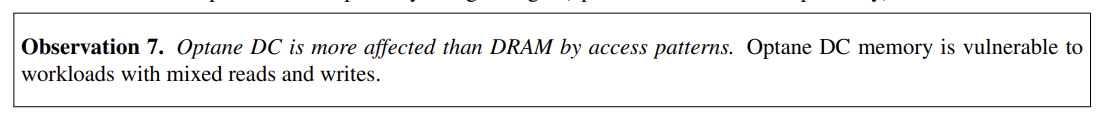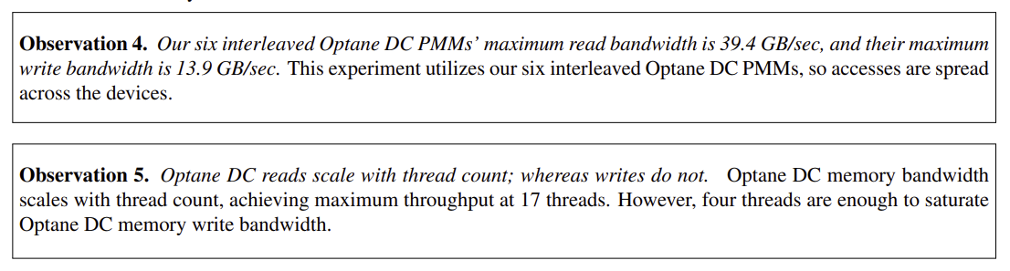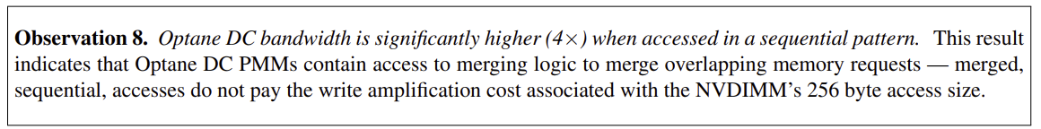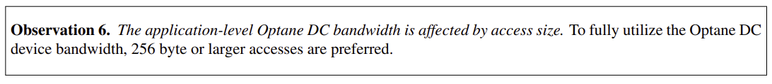 논문의 레퍼런스인 Izraelevitz, J., Yang, J., Zhang, L., Kim, J., Liu, X., Memaripour, A., Soh, Y. J., Wang, Z., Xu, Y., Dulloor, S. R., et al. Basic performance measurements of the intel optane dc persistent memory module. arXiv preprint arXiv:1903.05714 (2019) 의 3.2 section에서 다른 장치와 비교했을 때 일관되게 우수한 결과가 논문과 일치한다.
