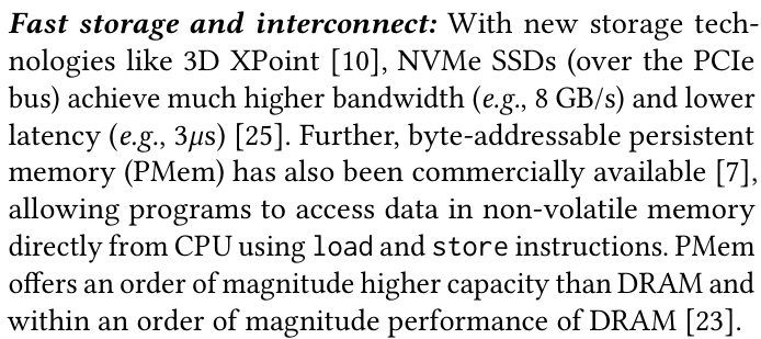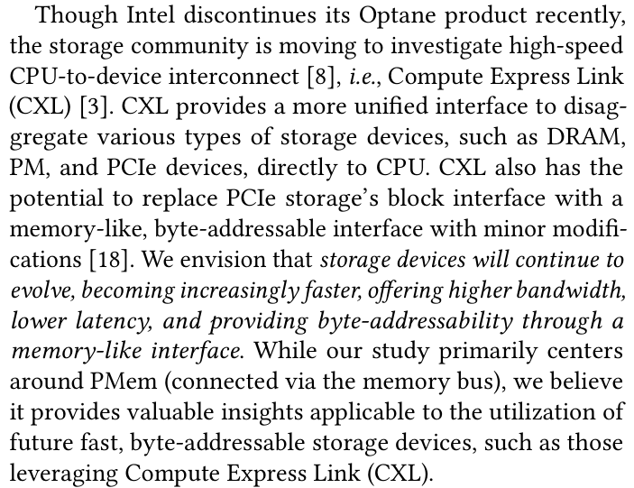 스토리지가 점점 빨라지고 점점 더 높은 대역폭을 제공하고 저점 더 낮은 지연시간을 제공하며 메모리처럼 바이트 주소 지정이 가능하게 될 것으로 예상된다. 해당 논문은 메모리 버스로 연결되는 pmem을 위주로 다루지만 cxl을 활용한 빠른 바이트 주소 지정이 가능한 스토리지에도 적용할 수 있을 것이다.