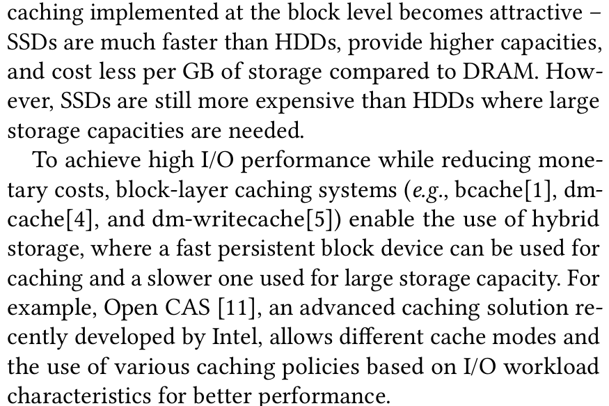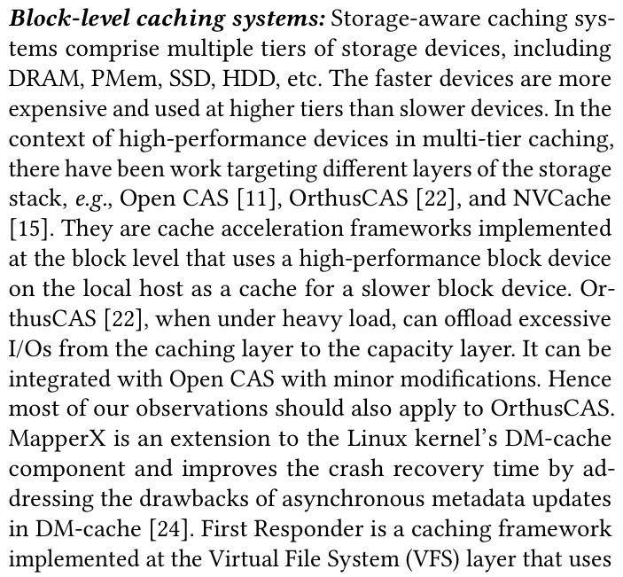 멀티 티어 계싱 (다계층 캐싱)에서 고성능 디바이스와 관련해서 스토리지 스택의 서로 다른 계층을 타겟팅하는 연구가 있었다. ex. open CAS, NVCache, orthusCAS 모두 로컬 호스트의 고성능 블록 디바이스를 느린 블록 디바이스의 캐시로 사용하는 블록 레벨에서 구현된 캐시 가속화 프레임워크이다.