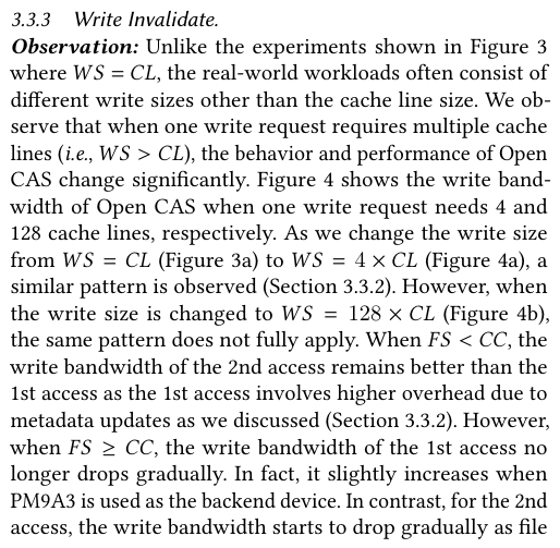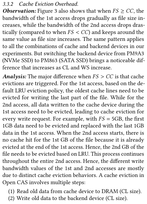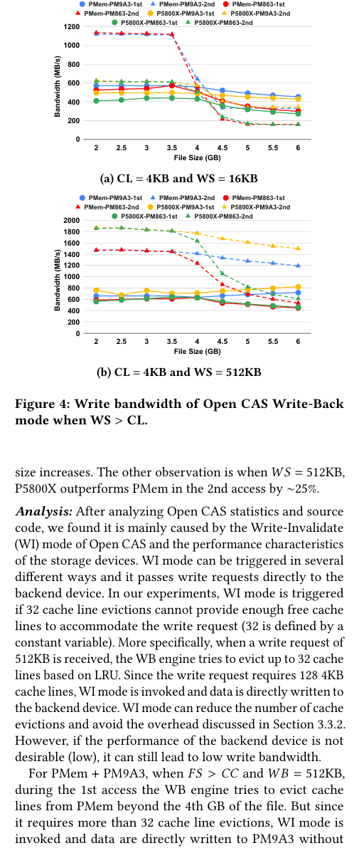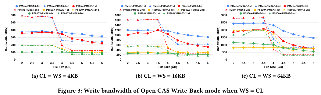 파일 크기가 캐시 용량보다 크거나 같을 때는 첫 번째 접근의 쓰기 대역폭이 더이상 줄어들지 않는다. 실제로 백엔드 장치로 pm9a3가 사용될 때 약간 증가한다. 반면에는 두 번째 접근에서 파일 크기가 커지면서 쓰기 대역폭이 서서히 감소한다.