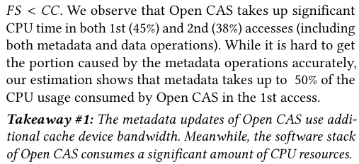 open CAS의 메타데이터 업데이트는 추가적인 캐시 장치 대역폭을 사용한다. 동시에 open CAS의 소프트웨어 스택은 상당한 cpu 자원을 소모한다.