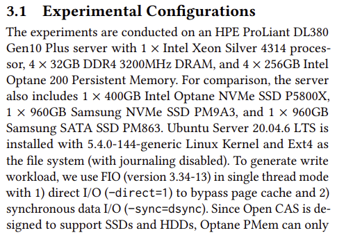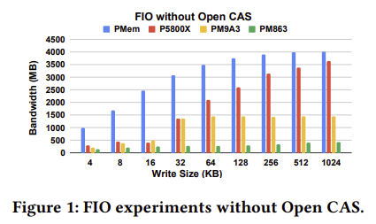 쓰기 워크로드를 생성하기 위해 FIO(버전 3.34-13)를 싱글 스레드 모드에서 사용하였으며, 페이지 캐시를 우회하기 위해 direct I/O(direct=1)를 사용했고, 동기식 데이터 I/O(sync=dsync)를 사용했고, Open CAS는 SSD와 HDD를 지원하도록 설계되어 있어서 Optane PMem은 일반 블록 장치로만 사용할 수 있으며 직접 접근(DAX) 모드는 지원되지 않는다.