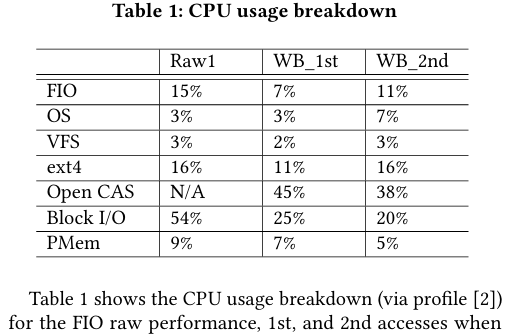표1은 fs < cc일 때 (파일 사이즈가 캐시 용량보다 작을 때) fio 기본 성능 첫 번째 두 번째 접근에 대한 cpu 사용률 분포를 나타낸다. open cas는 첫 번째 접근 45%과 두 번째 접근 38% 모두에서 메타데이터와 데이터 작업을 포함하여 cpu 시간을 상당히 소비한다. 메타데이터 작업으로 인해 발생하는 부분을 정확하게 측정하기는 어렵지만 추정에 따르면 첫 번째 접근에서 open cas가 소비하는 cpu 사용량의 최대 50%가 메타데이터에 할당됨을 알 수 있다.