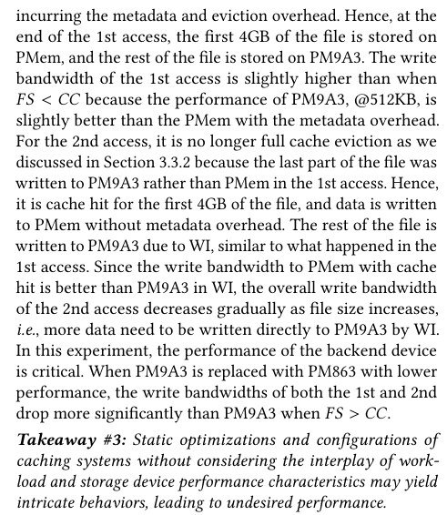 실험에서 백엔드 장치의 성능이 매우 중요하다. pm9a3을 더 안 좋은 성능인 pm863으로 교체할 때 파일 사이즈가 캐시 용량보다 크면 pm9a3을 사용하는 것보다 첫 번째와 두 번째 접근의 쓰기 대역폭이 훨씬 더 줄어든다.