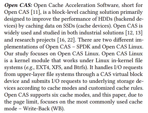 open CAS에는 두 가지 구현방식에는 SPDK, open CAS Linux가 있고 논문은 open CAS linux에 포커스를 두고 있다. 리눅스 커널 파일 시스템인 ext4, xfs, btrfs 등에서 작동하는 커널 모듈이며, 상위 레이어 파일 시스템으로부터 io요청을 받고 cas 가상 블록 디바이스로 하위 스토리지 디바이스에 io 요청을 전달해서 캐시 작업을 수행한다.