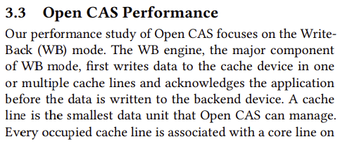 open cas의 write back WB모드에 포커스를 두고 open cas의 성능을 측정한다. WB모드의 주요 구성 요소인 WB 엔진은 데이터를 백엔드 장치에 쓰기 전에 먼저 캐시 장치의 하나 이상의 캐시 라인에 데이터를 쓰고 애플리케이션에 캐시 작업을 했다고 알려준다. 캐시 라인은 open cas가 관리할 수 있는 가장 작은 데이터 단위이다.